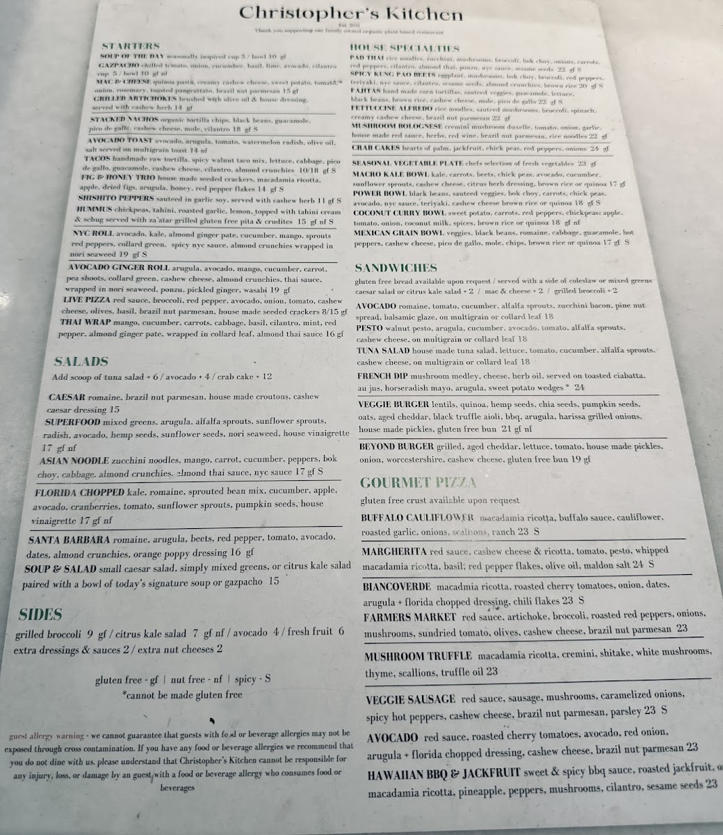 “ First time here at Christopher's Kitchen, came here on the recommendation of a friend. On the whole, excellent vegan food, my experience was mostly positive. The manager Anna greeted us at the door when we arrived and checked on us during our meal. That was the highlight of our service. We ordered the Live Pizza, Mac & Cheese, Artichoke to start, with our meal being the Fresh Market Pizza and the Pesto sandwich with side cesar. The appetizers were all excellent with the Live Pizza being particularly stand out. The mac and cheese was tastey but after a while it left me feeling a little one note, still very tasty. The sandwich was delicious, fresh bread, great texture. Side cesar was under dressed, heard a few other patrons dining say similar remarks. The Pizza was exceptional, will be trying a different one for sure when I return. The bad: other than Anna the service was poor, we only had our water refilled once when Anna came by. Nicholas, kind as he was in giving me a coffee to go for free, he was given a $10 bill to provide change and he never returned any money. Good spot for food but definitely be mindful of the time you come, you may have long waits for food and service. That being said I will be back one day to try them again. I'll update my review when I get back around. Until then enjoy your food! ”